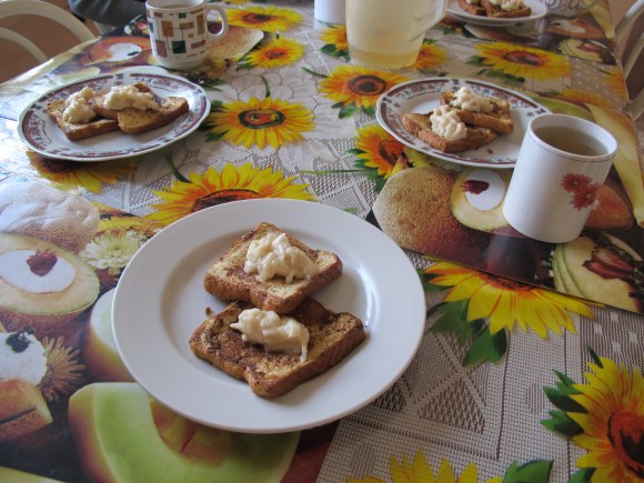 a couple of weeks ago, i decided that i would try to make an american dish for my family. understanding that we have two very different tastes, i opted for a sweet one, as peruvians love sweets. i made cinnamon french toast. they do not sell syrup here, so i was going to make a banana one, but my family does not like bananas. so i was going to try to make a strawberry one, but all the markets were out of strawberries, so i decided to just go local (as this should have been my first choice…oh well…). i made it with churimoya, which is a very, very sweet fruit. honestly, i can only usually take a couple of bites it’s that sweet, but it went nicely with the food.