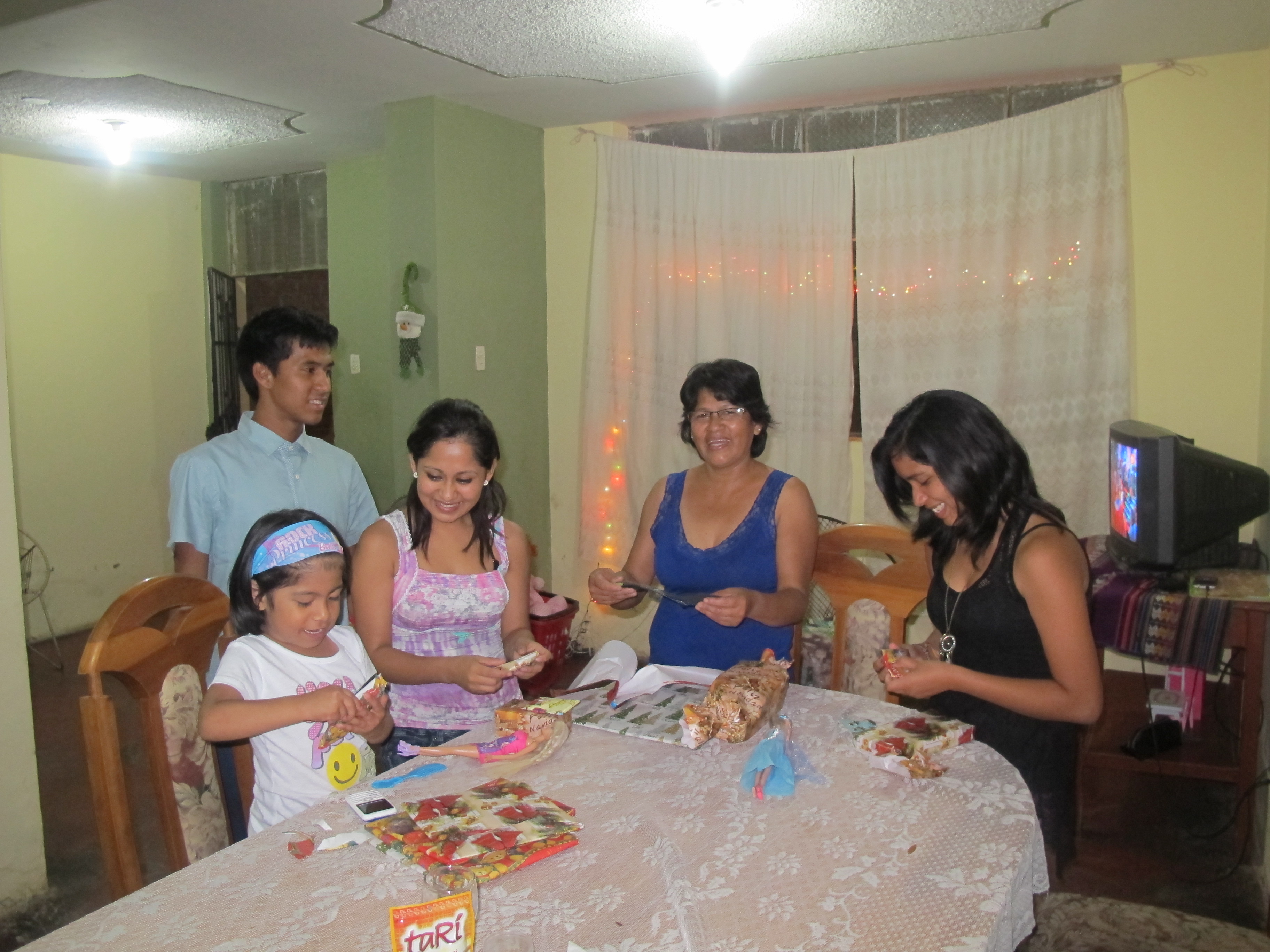 mp and i celebrated christmas peruvian style with my family. here, the celebrations begin at midnight on christmas day. so at midnight we ate dinner, and samia put the baby jesus in the nativity. we then exchanged gifts and thanks to mp and my dad and jill, my family had an amazing christmas, and loved their gifts so much. they were even so kind to give us peru shirts!